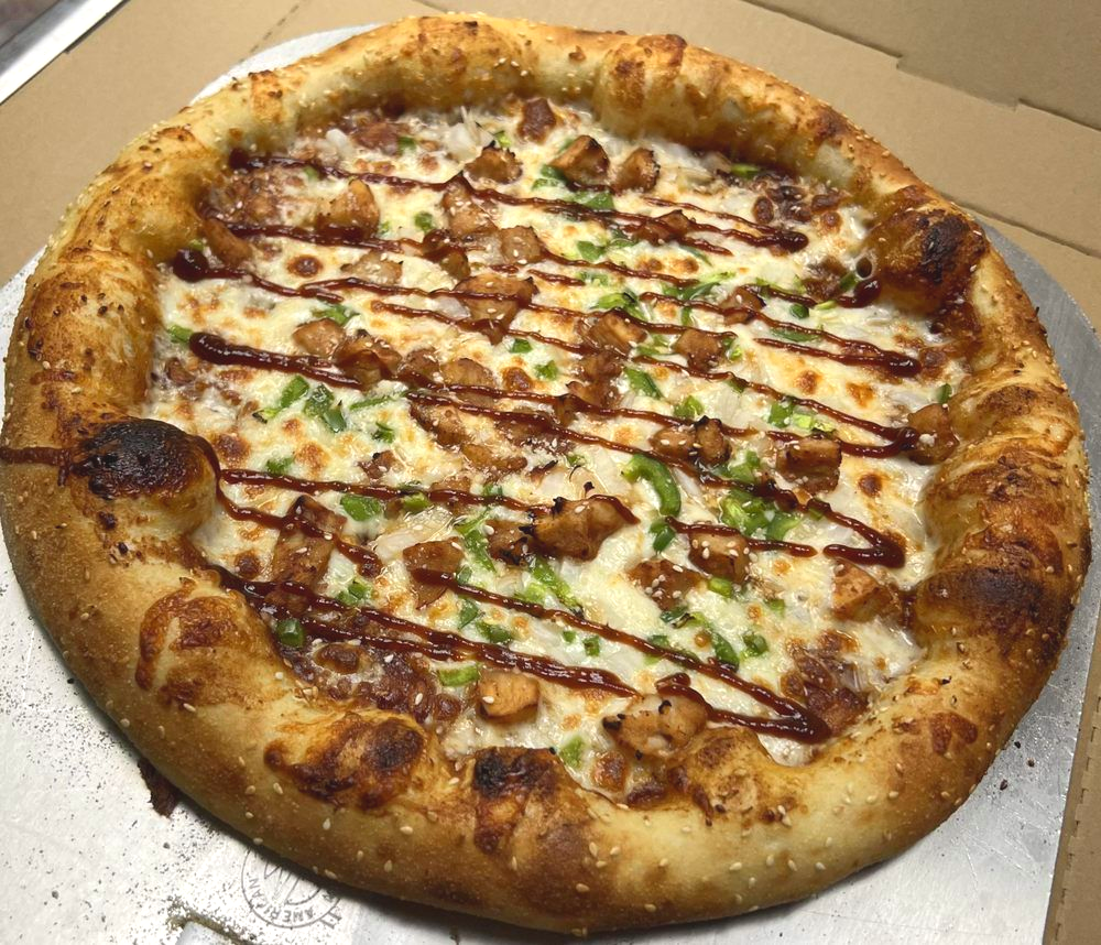 BBQ sauce, mozzarella, chicken, bell pepper, onions & olives